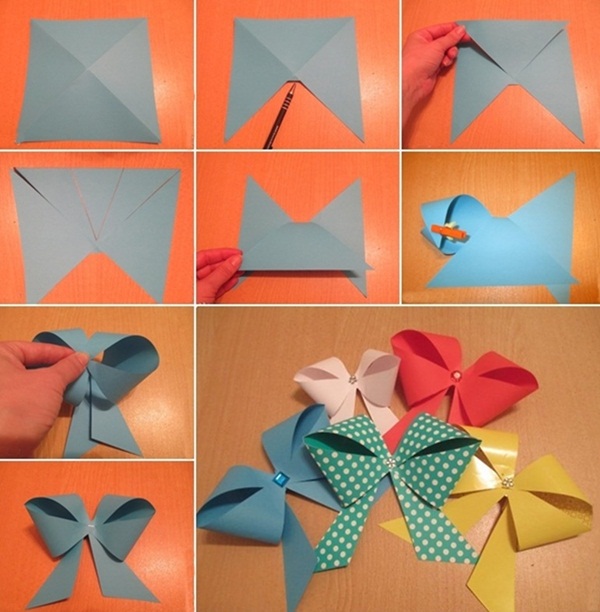 Estos lazos de colores son realmente fáciles de hacer. Estas artesanías de papel de colores seguramente se ven bonitas en las camisas de los niños en los días importantes. Para hacer un hermoso lazo de papel, puedes comenzar con una hoja de papel cuadrada. Dobla la hoja de papel cuadrada en diagonal desde ambos lados. Obtienes cuatro triángulos en la hoja cuadrada. Recorta una forma triangular de la hoja de papel cuadrada. Ahora, para el triángulo opuesto, haz tres divisiones de áreas iguales. Corta estas líneas y quita la sección del medio. Ahora dobla los bordes de los triángulos laterales hacia adentro para obtener un lazo hinchado en los lados. Selle los extremos del triángulo con pegamento. Puede agregar algunas lentejuelas o cuentas encima. Esto seguramente se verá bonito.