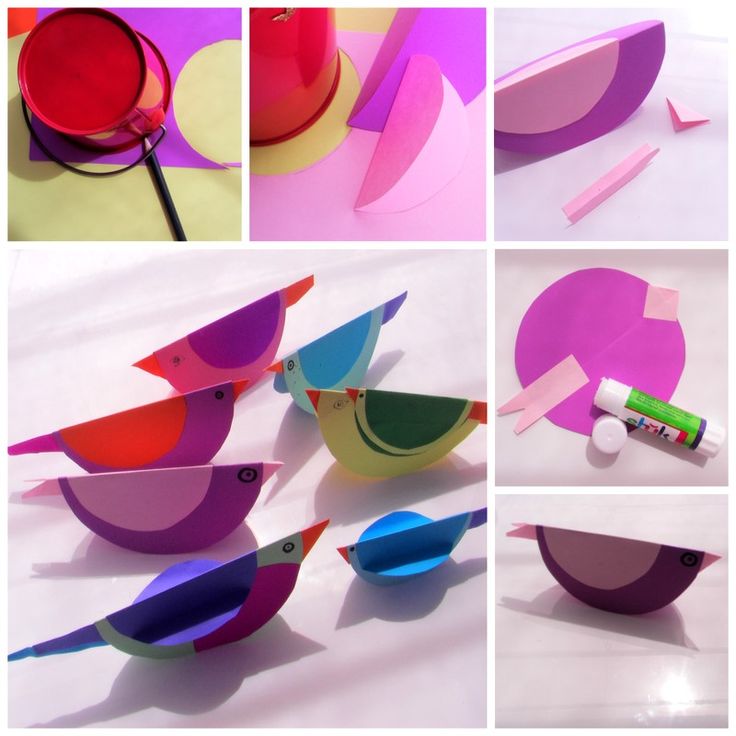 Es una idea de manualidades de papel paso a paso fácil de hacer. Los niños pueden hacer fácilmente estos pájaros coloridos en el aula y jugar con ellos más tarde. El maestro debe proporcionar a los estudiantes papel de colores, plantillas, un par de tijeras, barra de pegamento y bolígrafos. El maestro también debe dar instrucciones claras a los estudiantes. Comience cortando un círculo grande de una hoja de papel de color, corte uno más pequeño de un papel de diferente color. También corte el pico y la cola del pájaro artesanal de papel de la misma hoja de color de la que se cortó el círculo más pequeño. Dobla los círculos por la mitad, pega el pico y la cola en el círculo más grande. Pegue el círculo más pequeño sobre el pico y la cola en el círculo más grande. Añade un ojo para el pájaro. Puede hacer variaciones en el diseño agregando cola bicolor o alas batidas, etc.